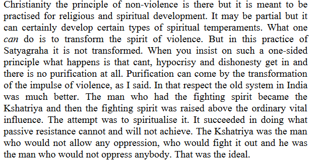 அரவிந்தரின் தத்துவ அணுகுமுறையானது மானுடப் பரிணாம வளர்ச்சியையும் அவனது சகல பரிமாணங்களையும் சாத்தியக் கூறுகளையும் கருத்தில் கொண்டது;  அவரது ஆன்மிகம் ஏறத்தாழ அறிவியல்பூர்வமானது. ஆகவே, அவரது சட்டகத்தில் க்ஷத்ர தர்மத்தை மட்டும் எடுத்துக்கொண்டு விமர்சிக்க முடியாது என்பது என் எண்ணம். அதனால்தான் – நான் சாராம்சம் என எழுதும்போது அப்படிக் குறிப்பிட்டேன்.