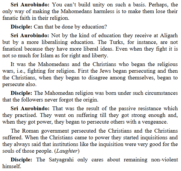 “அரவிந்தரின் பார்வை இந்தியாவின் கடந்த கால நிலப்பிரபுத்துவ வரலாறு சார்ந்து உருவாக்கப்பட்ட பழமைவாத அணுகுமுறை, இந்துத்துவர்களுக்கு மட்டுமே உவப்பானது.”