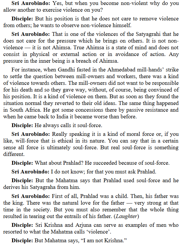 அஹிம்சை குறித்து ஸ்ரீ அரவிந்தர் ‘சாமான்ய’ மற்றும் ‘ஆன்மீக’ தளத்தில் பல நேரங்களில் விளக்கியுள்ளார். (நீங்கள் உதாரணங்கள் கொடுத்தது போல) எனவே ஜெவின் பதில் சத்தில்லாதது.