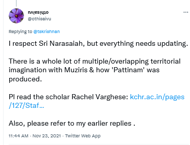 I was not talking about Nelcynda nor ‘Muziris being an Island.’ I was NOT saying that ‘Muziris’ was not a harbour. It is truly puzzling – as to why these were brought up. May be he mixed up ‘inland’ with ‘island?’ Am not sure.