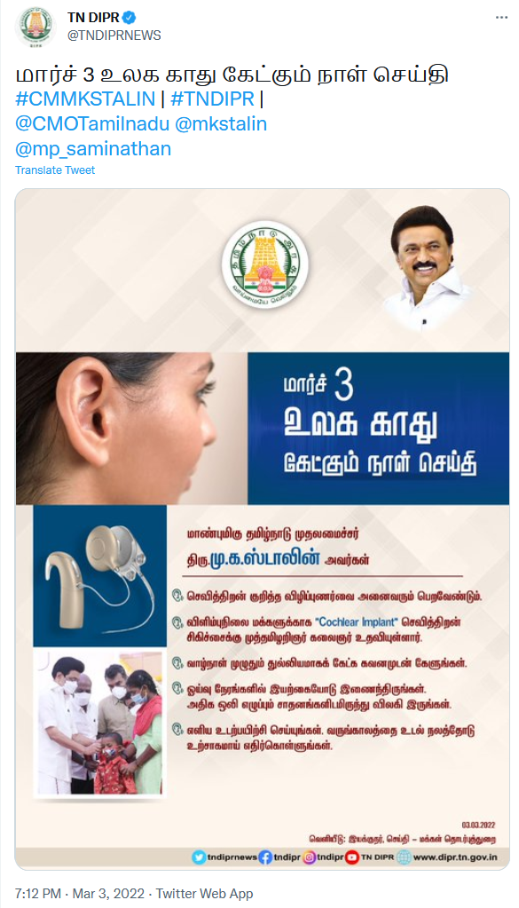 மாண்புமிகு தமிழக திராவிடஸ்டாக் முதலையமைச்சர் இசுடாலிர், உலக வரலாற்றிலேயே முதன்முறையாக ‘உலக காது கேட்கும் நாள்’ செய்தியை நேற்று விடுத்து, அனைவர் காதுகளிலும் ஈயத்தை ஊற்றியது  எனும் அரிய தமிழ்நிகழ்வு செந்நிகழ்வு நாம் அனைவரும் ஏகோபித்து அறிந்து புளகாங்கிதம் அடைந்த விஷயமே!!