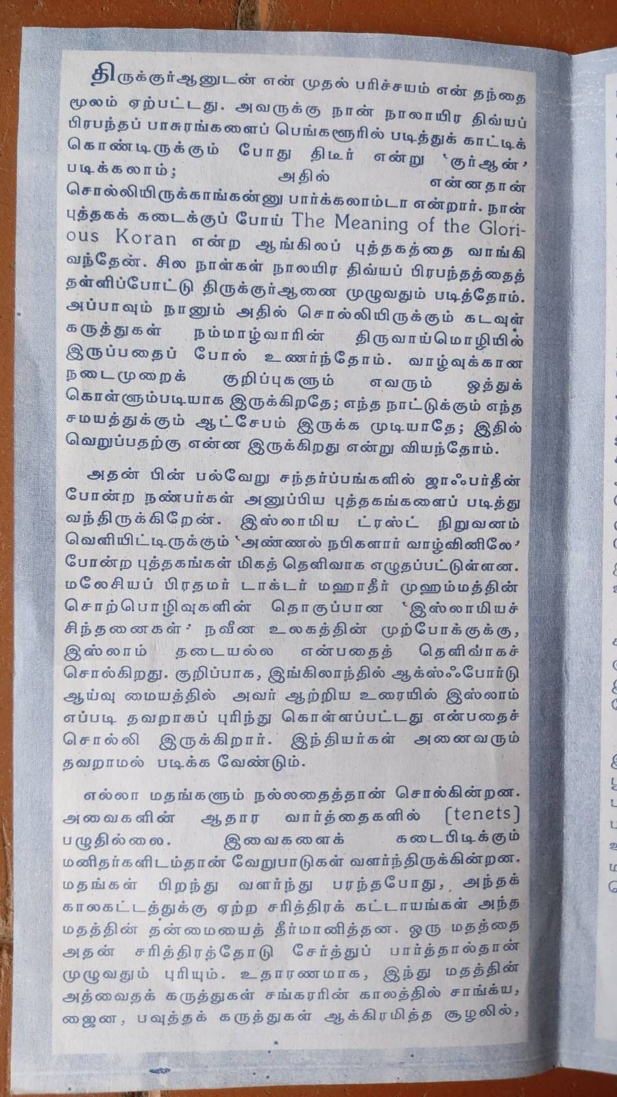 ஏதோ இஸ்லாமிய பழக்கவழக்கங்களின் தமிழக வடிவங்கள் பற்றி அவருடன்  ஆர்வத்துடன் பேசிக் கொண்டிருந்தேன் என நினைவு; ஆனால் அவர் அதனை ஒருமாதிரி புரிந்துகொண்டு மதமாற்ற தாவாவில் ஏறக்குறைய ஈடுபட்டு எனக்கு ஒரு பெரிய கத்தை பரப்புரை பிட்நோட்டீஸ்களைக் கொடுத்தார், பாவம். “படிங்க சார், இஸ்லாம் அறிவியல் பூர்வமானது. கம்ப்யூட்டர் பத்தியெல்லாம் அதுல இருக்கு. சுஜாதா என்ன சொல்லியிருக்கார் பாருங்க. உங்களைப் போன்றவங்க மார்க்கத்துக்கு எவ்வளவோ செய்யலாம்…”