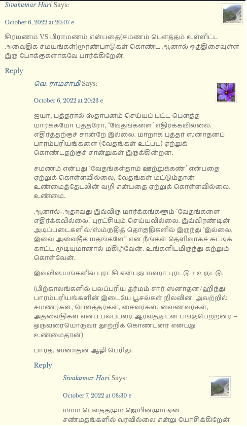 முந்தைய கட்டுரையில் (கோதம ‘புத்தர்,’ பௌத்தம் எனும் ஹிந்து/ஸனாதன மார்க்கமொன்று – கேள்விகள், குறிப்புகள் October 6, 2022) எழுதியிருப்பது தான் – பௌத்தமும் சமணமும் சர்வ நிச்சயமாக வேதங்களை மறுதலிக்கவில்லை என்றாலும் , மாறாக மதித்தாலும், தாங்கள் தர்ம மார்க்கத்தினரே எனச் சொன்னாலும் ஹிந்து/தார்மீக வழிமுறைகளில் வேதங்களைப் பின்பற்றியேயாக வேண்டும் என்கிற கட்டாயம் இல்லை.