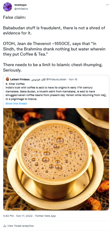 On the other hand, Jean de Thevenot ~1650CE, says that “in Sindh, the Brahmins drank nothing but water wherein they put Coffee & Tea.” There needs to be a limit to Islamic chest-thumping. Seriously.