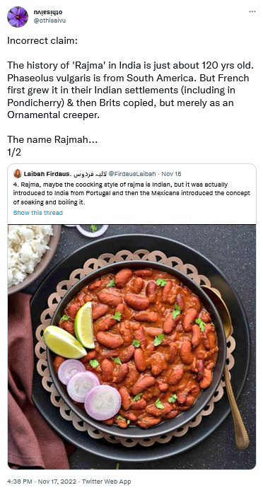 The history of ‘Rajma’ in India is just about 120 years old, that’s all. It has nothing to do with Portugal.