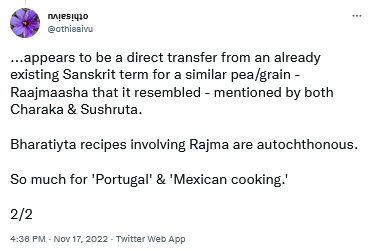 Bharatiyta recipes involving Rajma are autochthonous. So much for ‘Portugal’ & ‘Mexican cooking.’