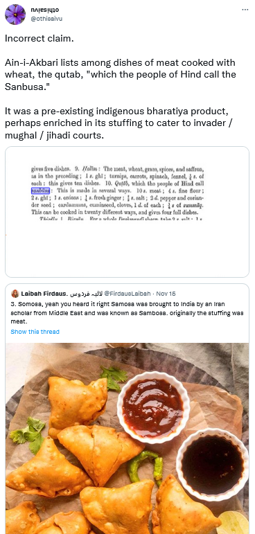 Ain-i-Akbari lists among dishes of meat cooked with wheat, the qutab, “which the people of Hind call the Sanbusa.” It was a pre-existing indigenous bharatiya food product, perhaps enriched in its stuffing to cater to invader / mughal / jihadi courts.