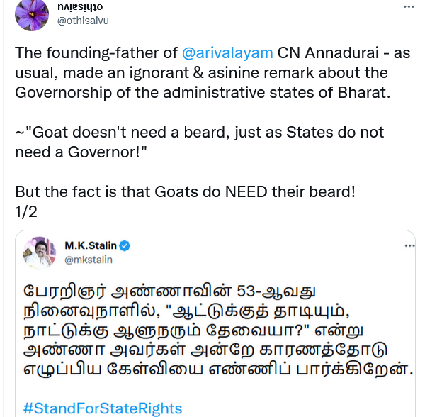 ஒருமாதிரி ‘ஆட்டுக்குத் தாடியும் நாட்டுக்கு கவர்னரும் தேவையில்லை’ என்று எப்போதோ 1960களின் இறுதியில் ‘அறிஞர்’ அண்ணாதுரை ஒருமாதிரி அடுக்குமொழித்தனமாகப் பேசியிருக்கிறார். (எங்கு எதற்கு அப்படிச் சொன்னார் என்பது நினைவிலில்லை – என் கைவசம் இருக்கும் குறிப்புகளிலும் இல்லை; இருந்தாலும் அவர் அப்படி உளறிக் கொட்டினார்தாம்.)