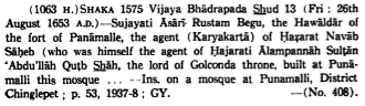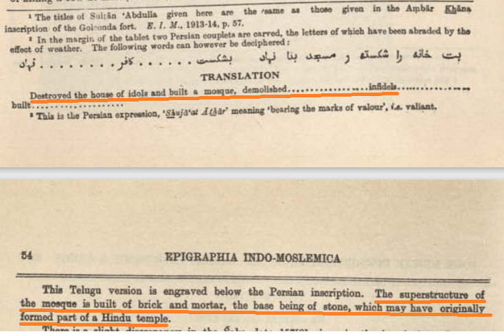 4. யஸ்தானி அவர்கள் அடிக்குறிப்பில் எழுதுகிறார் –  “In the margin of the tablet, two Persian couplets are carved, the letters of which have been abraded by the effect of weather. The following words, however, can be deciphered: Destroyed the house of idols and built a mosque, demolished infidels built.”