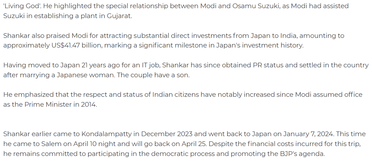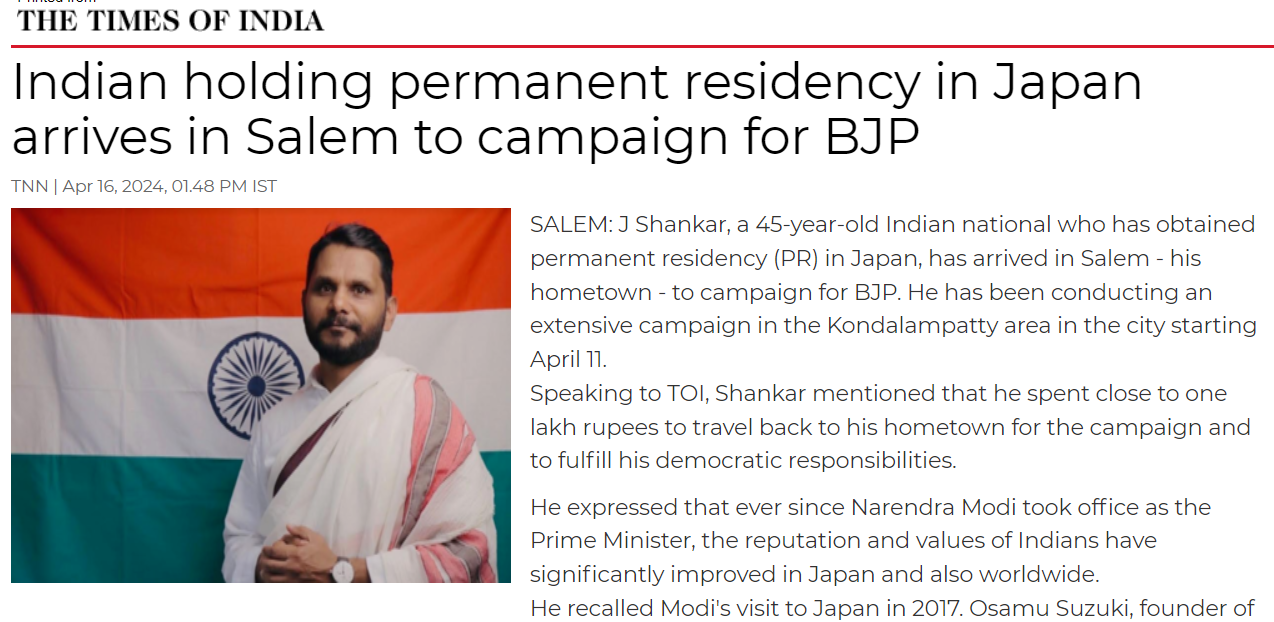 It seems to have worked well. These types of straightforward, raw truth statements had a strong impact on the people. We specifically went to the homes of Dravidian voters and neutral voters. Hopefully, it seems there are positive changes among our people. TOI published news about my campaign (தினத்தந்தி, the Tamil version, also published similar news). I provided them with the ‘Ministry of Foreign Affairs of Japan’ website link regarding the data of Japan’s investment in Bharat.