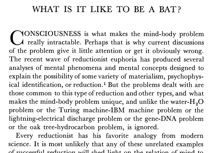 (What Is It Like to Be a Bat?, Thomas Nagel, The Philosophical Review, Vol. 83, No. 4 (Oct., 1974), pp. 435-450. Online)