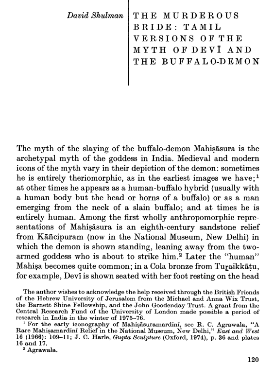 (Shulman, D. (1976). The Murderous Bride – Tamil Versions of the Myth of Devī and the Buffalo-Demon. History of Religions, 16(2), 120–146)