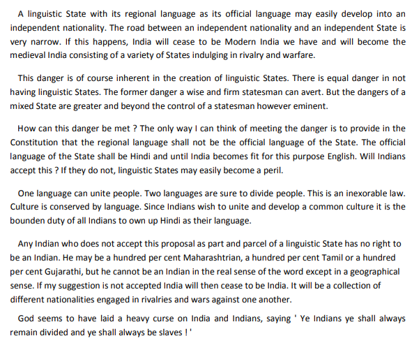 “ஒரு மொழிவாரி மாநிலம், அதன் பிராந்திய மொழியை அதன் அதிகாரபபூர்வ மொழியாகக் கொண்டிருப்பது, எளிதில் ஒரு சுயாதீன தேசிய இனமாக [இனம் என்பதே அறிவியல் பூர்வமற்ற உளறல் பம்மாத்து என்பது வேறு விஷயம்!] உருவாகலாம்.